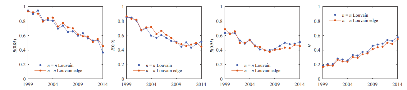 The index a: the number of branches (papers), b: the number of nodes (tokes), c: the number of edges, d: the global clustering coefficient, e: the average length of shortest paths, and f: the proportion of giant component. |