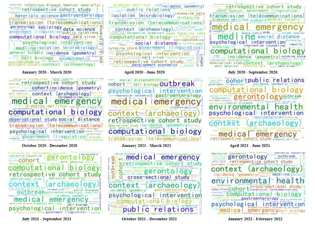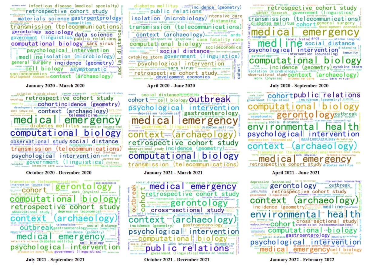 (1) During the initial phase of the COVID-19 pandemic from January to March 2020, policies focused primarily on internal medicine, computer science, medical emergencies, and emergency medicine, as indicated by the concentration in the upper-left quadrant. This reflects a swift policy response to the pressures placed on the healthcare system by the pandemic, particularly in the areas of emergency and internal medicine. However, policies may not have fully leveraged the applications of computer science in medical emergencies, such as telemedicine and data analytics—technologies critical for alleviating strain on medical resources and enhancing the efficiency of healthcare services.