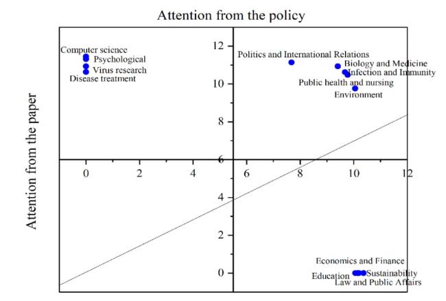 Simultaneously, disciplines in the upper-right quadrant, such as psychology, immunology, virology, and microbiology, garnered significant attention within academia. Yet, these academic research findings appear not to have been adequately translated into policy actions. Research in immunology and virology is crucial for vaccine development and pandemic control, but policies may not have fully utilized these insights to guide public health strategies. Additionally, psychology plays a vital role in understanding the impact of the pandemic on public mental health, yet this area may also have been overlooked.
