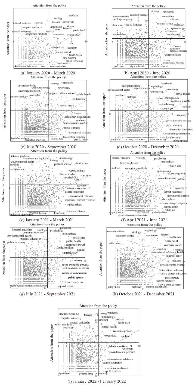 (9) During the period from January to February 2022, terms in the upper-left quadrant, such as internal medicine, computer science, and public relations, received some policy attention but may not have fully reflected their actual importance in pandemic response. Specifically, the critical role of public relations in pandemic communication and the potential of computer science in data management and analysis were possibly underutilized by policies.