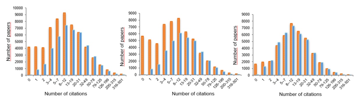 Figure 3. Histogram with logarithmic binning of citations to world publications in the scientific topics of solar cells, semiconductors, and immunity (from left to right). Blue bars correspond to a lognormal synthetic series to guide the eye. Publication window: 2014-2017; citation window: 2019-2022. |