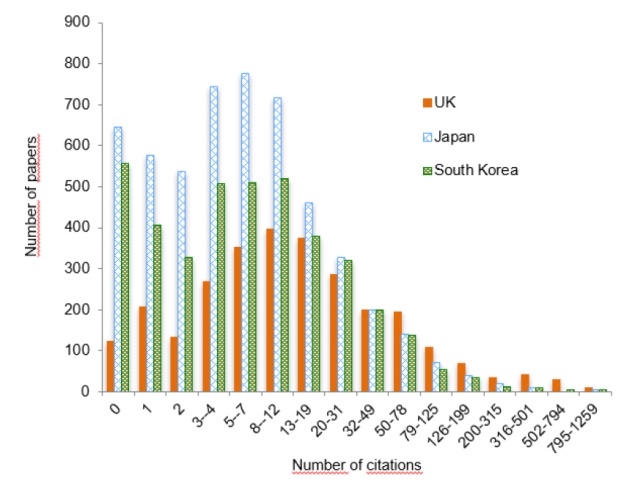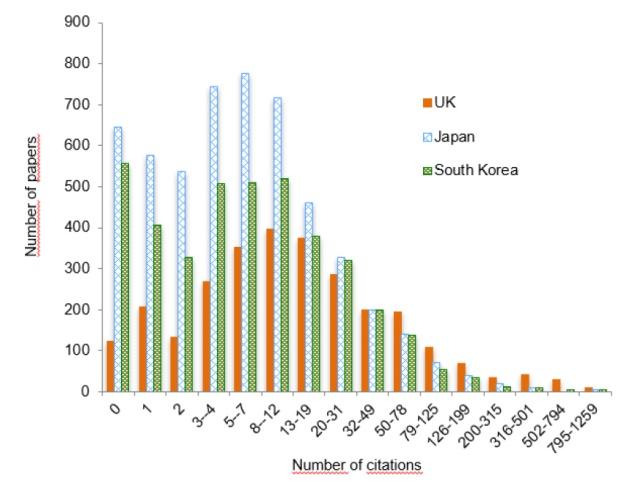 Figure 4. Histogram with logarithmic binning of citations to publications from the UK, Japan, and South Korea on the scientific topic of solar cells. Publication window: 2014-2017; citation window: 2019-2022. |