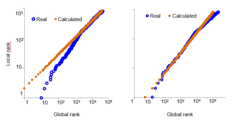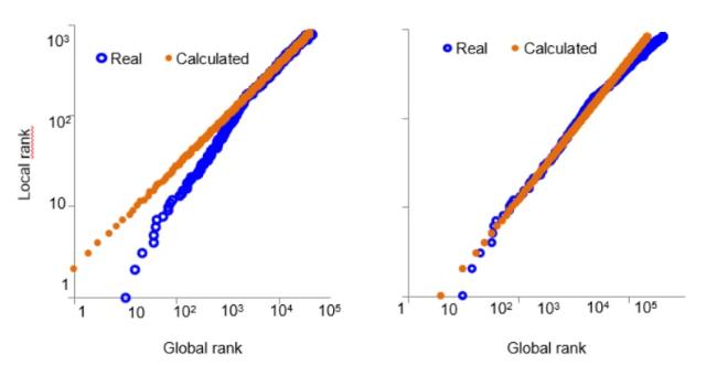 Figure 6. Local versus global ranks of US domestic papers published by the universities of Harvard, Stanford, Yale, and Massachusetts Institute of Technology in immunology. Comparison of the actual ranks of the papers of these universities with the ranks calculated for the power laws defined by P and Ptop 10% (left panel), and Ptop 10% and Ptop1% (right panel). |