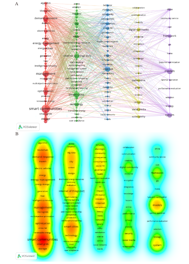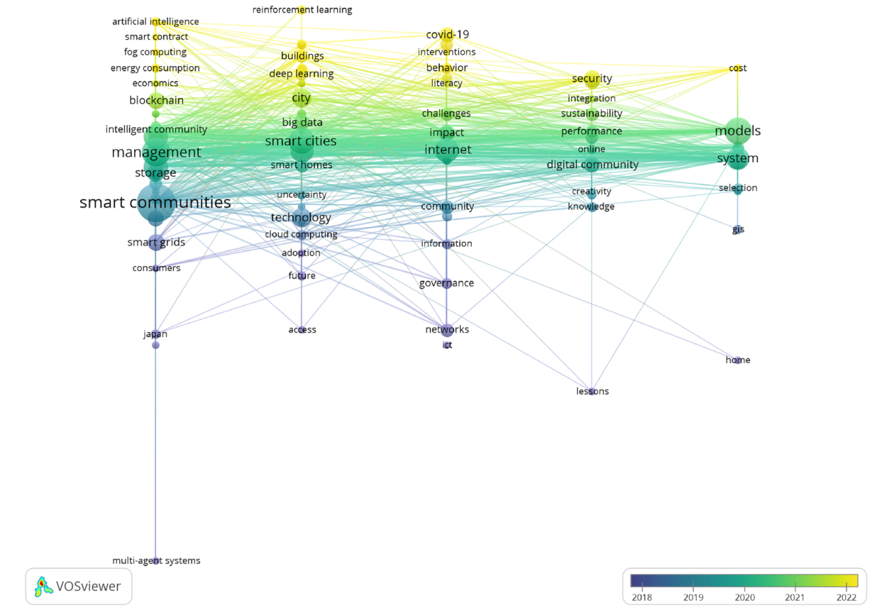 Figure 11. In the keyword time-evolution map for smart community research (2000-2024). Notes: Each node represents a distinct keyword, with node size proportional to its frequency of occurrence. Edges between nodes indicate instances of co-occurrence within the same documents. The node color reflects the period during which the keyword was most active: blue for the early stage, green for the middle stage, and yellow for the recent stage. |