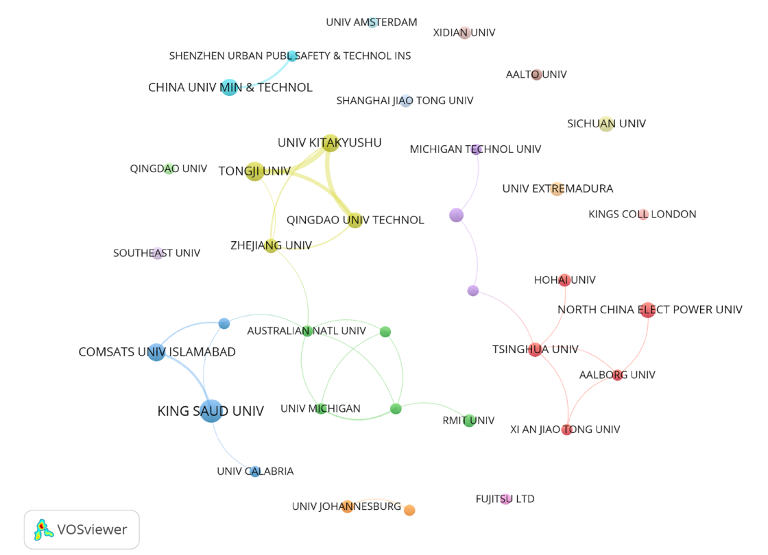 Figure 6. Institutional collaboration network in smart community research (2000-2024). Notes: Each node represents a distinct institution, with node size proportional to its total number of publications. Edges between nodes indicate collaborative relationships, and their thickness corresponds to collaboration strength. Node colors distinguish different collaboration clusters, and the spatial proximity of any two nodes reflects the frequency of their cooperation—nodes positioned closer. |