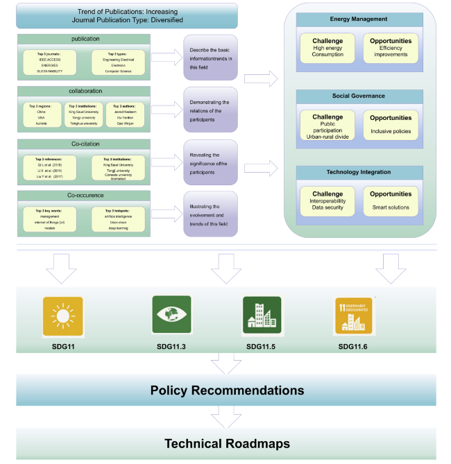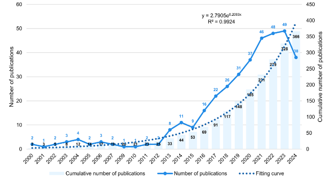 Figure 2. Trend analysis of annual publication volume in smart community research (2000-2024). Notes: The horizontal axis denotes the publication years (2000-2024). The left vertical axis shows the number of publications per year, while the right vertical axis indicates the cumulative total number of publications since 2000. The light blue bars represent the cumulative count of publications for each year, and the solid blue line illustrates the annual publication trend. |