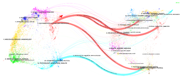 Figure 3. Overlay analysis of two charts for smart community research (2000-2024). Notes: In the overlay map, colors denote the disciplinary categories to which each publication belongs. Lines between nodes indicate citation or referenced-by relationships. Regions composed of densely connected nodes sharing the same color form clusters, each representing a specific academic research domain. |