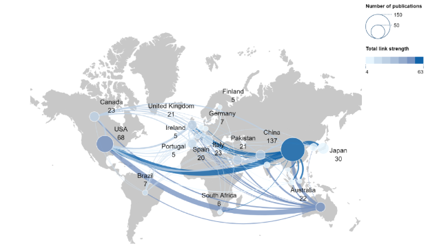 Figure 4. The country collaboration map for smart community research (2000-2024). Notes: The size of the notes indicates the number of publications, while color intensity reflects the strength of collaboration. Edges denote cooperative relationships, with thicker lines signifying closer partnerships. |