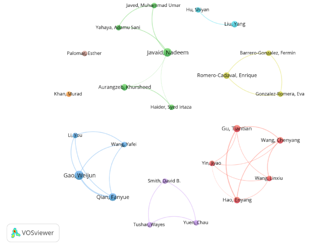 Figure 5. Author collaboration network in smart community research (2000-2024). Notes: Each node represents a single author, with the node size proportional to the author’s publication count. Edges denote co-authorship relationships. Clusters of similarly colored nodes indicate distinct collaboration groups. The spatial proximity of any two nodes reflects the frequency of their collaboration—nodes positioned closer together have collaborated more often. |