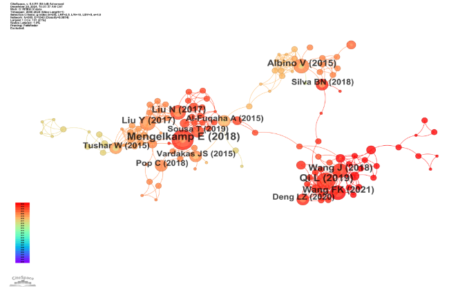 Figure 7. Co-citation network of references in smart community research (2000-2024). Notes: In this visualization, each node corresponds to a single publication, with the node size proportional to its co-citation frequency. The edges between nodes indicate co-citation links. Node colors are assigned by a time-heat algorithm to reflect different temporal co-citation periods: red hues denote recent high-frequency co-citations, while blue-green hues indicate earlier citation hotspots. |