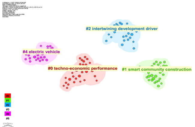 Figure 8. Reference clustering map for smart community research (2000-2024). Notes: In this visualization, each node represents a cited reference, and edges between nodes indicate co-citation relationships. Distinct colors delineate multiple clusters, each corresponding to a specific knowledge subfield. Every cluster is labeled with high-frequency terms automatically extracted by the system, and cluster identifiers begin at #0, with smaller numbers denoting larger cluster size and greater centrality. |