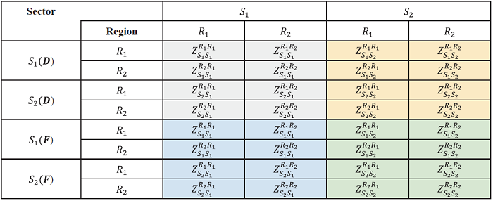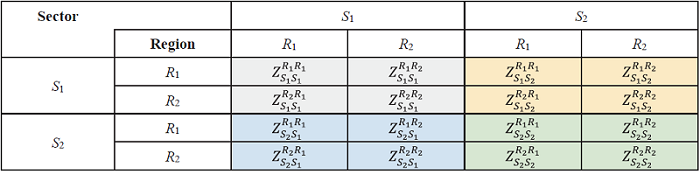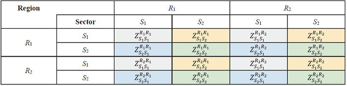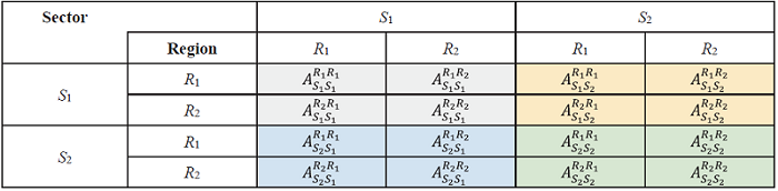 Table 4. IRIO table for two regions and two sectors in country A (intermediate use area). |