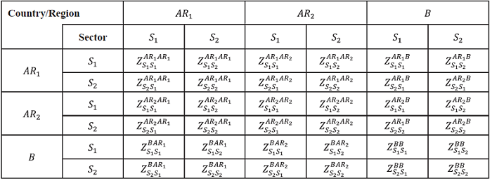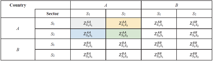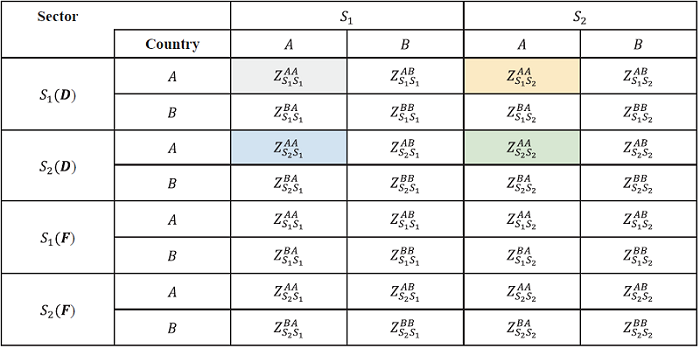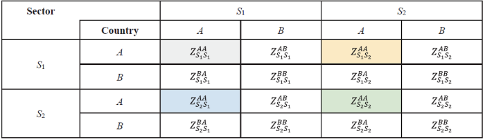 Table 3. ICIO table for two countries and two sectors (intermediate use area). |