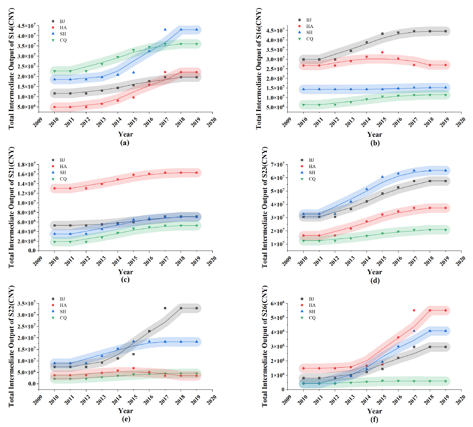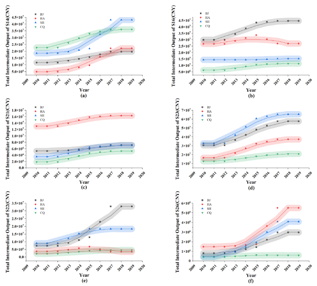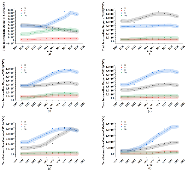 Figure 3. FIS Output Trends by Sector and Province Based on OE-IRIO (2010-2019). a-f show the OE-IRIO row sum (sector’s total intermediate output to the rest of China) for sectors S14, S16, S21, S23, S22 and S26, respectively. Colored dots and lines represent provinces: gray = Beijing, red = Henan, blue = Shanghai, green = Chongqing. |