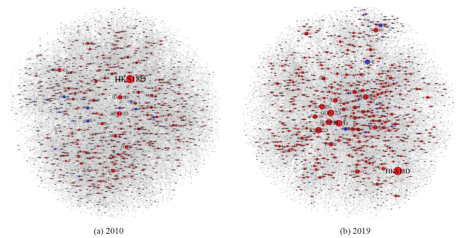 Figure 4. Topology of the GDFEBN-PRC model. (a) and (b)shows the network structure in 2010, and panel (b) shows the structure in 2019. Red nodes represent domestic-invested sectors (DIS), and blue nodes represent foreign-invested sectors (FIS). Node size reflects node degree, indicating the level of connectivity within the network. |