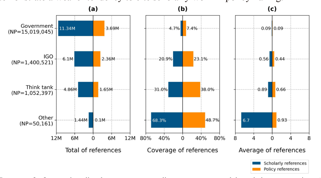Figure 4. Presence of references in policy documents across policy sources, presented through three perspectives: (a) total, (b) coverage, and (c) average. |