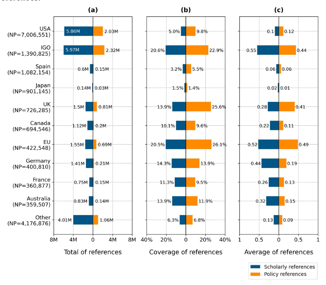 Figure 5. Presence of references in policy documents from the top 10 countries/regions with the highest number of policy documents, presented through three perspectives: (a) total, (b) coverage, and (c) average. |
