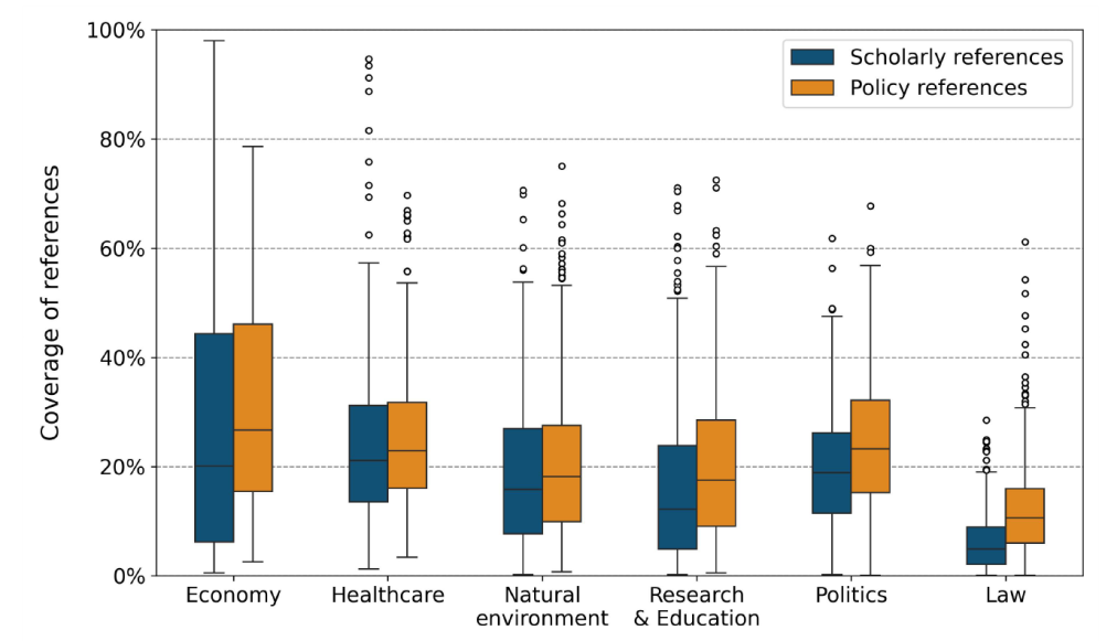 Figure 9. Distribution of the coverage of scholarly and policy references across topics within the six clusters. |