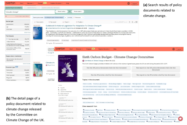Figure 1. Screenshots of the Overton web interface: (a) an example of search results and (b) a detail page of a specific policy document. |