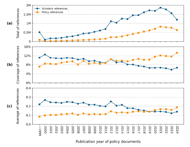 Figure 2. Presence of references in policy documents over publication years, presented through three perspectives: (a) total, (b) coverage, and (c) average. |