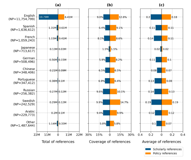 Figure 6. Presence of references in policy documents across the top 10 most used languages, presented through three perspectives: (a) total, (b) coverage, and (c) average. |