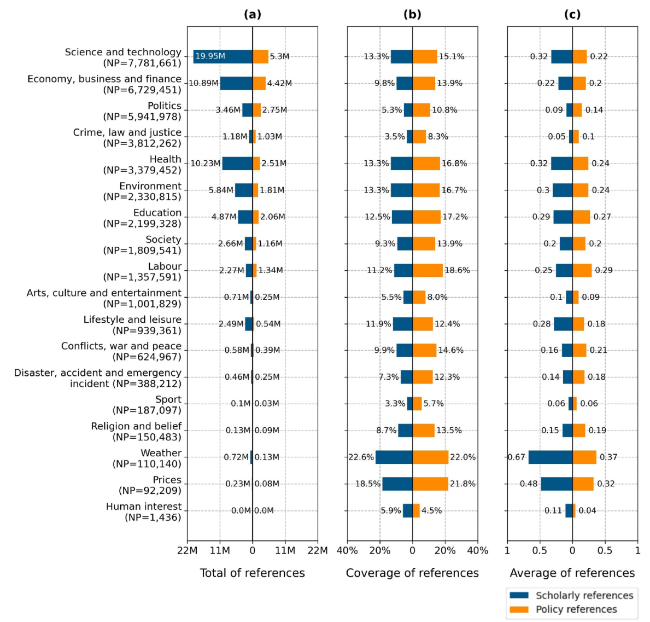 Figure 7. Presence of references in policy documents across subject areas, presented through three perspectives: (a) total, (b) coverage, and (c) average. |