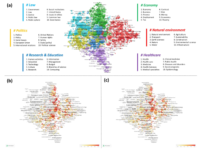 Figure 8. (a) Co-word network of topics in Overton-indexed policy documents; overlay visualizations of topics colored based on scores reflecting (b) the coverage of scholarly references and (c) the coverage of policy references. In the overlay visualizations, scores of topics are normalized using the “divide by mean” function in VOSviewer. The redder a topic node, the higher the coverage of scholarly or policy references in the policy documents related to that topic, relative to all topics in the map. |